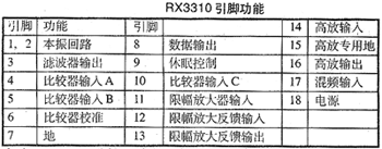 RX3310A是台湾HMARK公司生产的专门用于幅度键控ASK调制的无线遥控及数传信号的接收集成电路,内含低噪音高频放大、混频器、本机振荡、中频放大器、中频滤波器、比较器等,为一次变频超外差电路,双列18脚宽体贴片封装,主要技术指标如下: