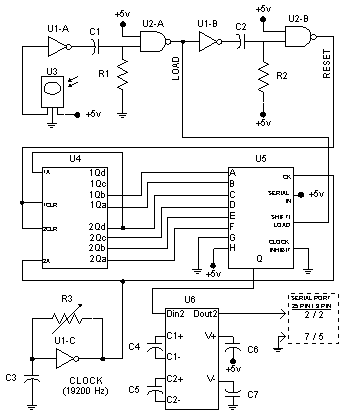 电路检测数字信号的每个周期并发送到计算机串口。时钟电路由U1-c、R3、C3组成。当