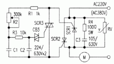 电路见图。将两只单向可控硅SCRl、SCR2反向并联.再将控制板与本触发电路连接,就组成了一个简单实用的大功率无级调速电路。这个电路的独特之处在于可控硅控制极不需外加电源,只要将负载与本电路串联后接通电源,两个控制极与各自的阴极之间便有5V~8V脉动直流电压产生,调节电位器R2即可改变两只可控硅的导通角,增大R2的阻值到一定程度,便可使两个主可控硅阻断,因此R2还可起开关的作用。该电路的另一个特点是两只主可控硅交替导通,一个的正向压降就是另一个的反向压降,因此不存在反向击穿问题。但当外加电压瞬时超过阻断电压时,SCR1、SCR2会误导通,导通程度由电位器R2决定。SCR3与周围元件构成普通移相触发电路,其原理这里从略。