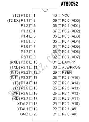 XTALl、XTAL2(19~18脚):时钟电路引脚。当使用内部时钟时,这两个引脚端外接石英晶体和微调电容。当使用外部时钟时,用于外接外部时钟源。