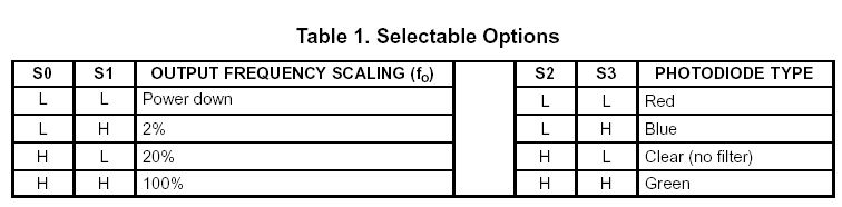 S0、S1用于选择输出比例因子或电源关断模式;S2、S3用于选择滤波器的类型;OE反是频率输出使能引脚,可以控制输出的状态,当有多个芯片引脚共用微处理器的输出引脚时,也可以作为片选信号,OUT是频率输出引脚,GND是芯片的接地引脚,VCC为芯片提供工作电压,表1是S0、S1及S2、S3的可用组合。